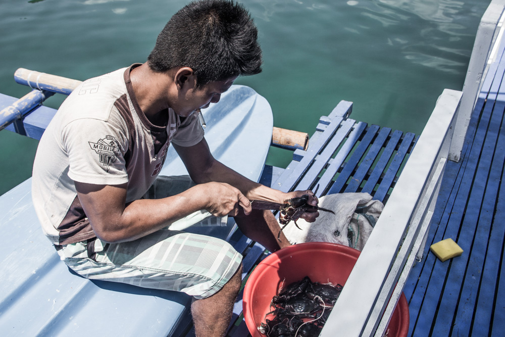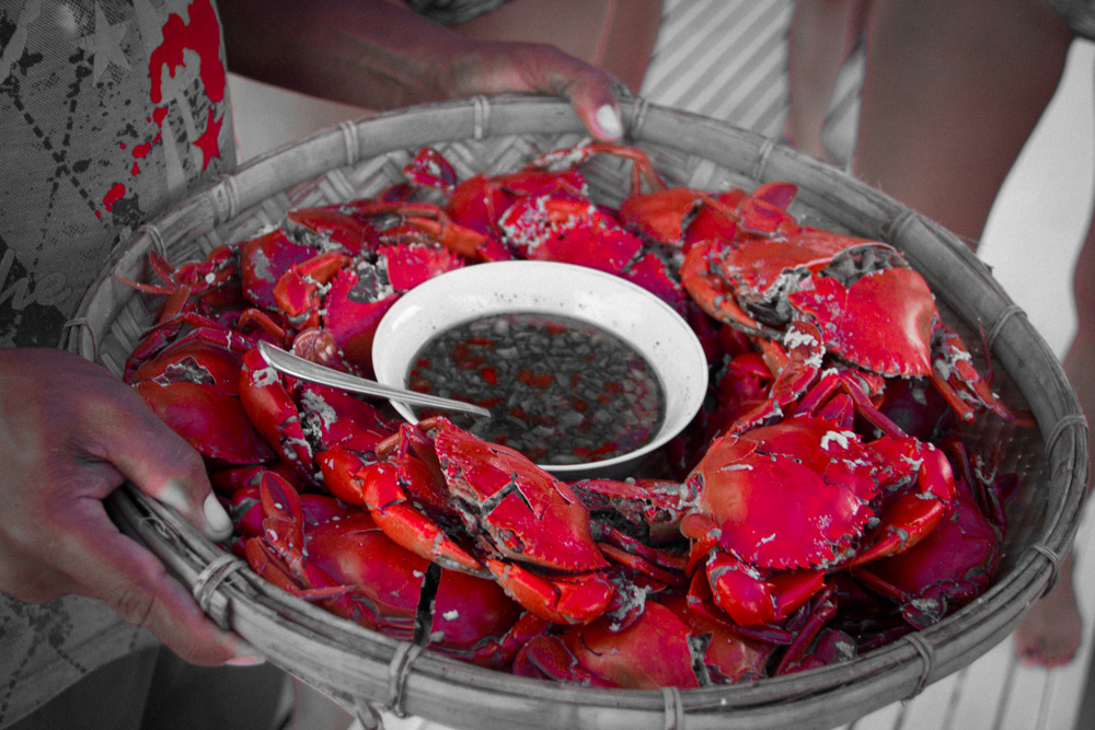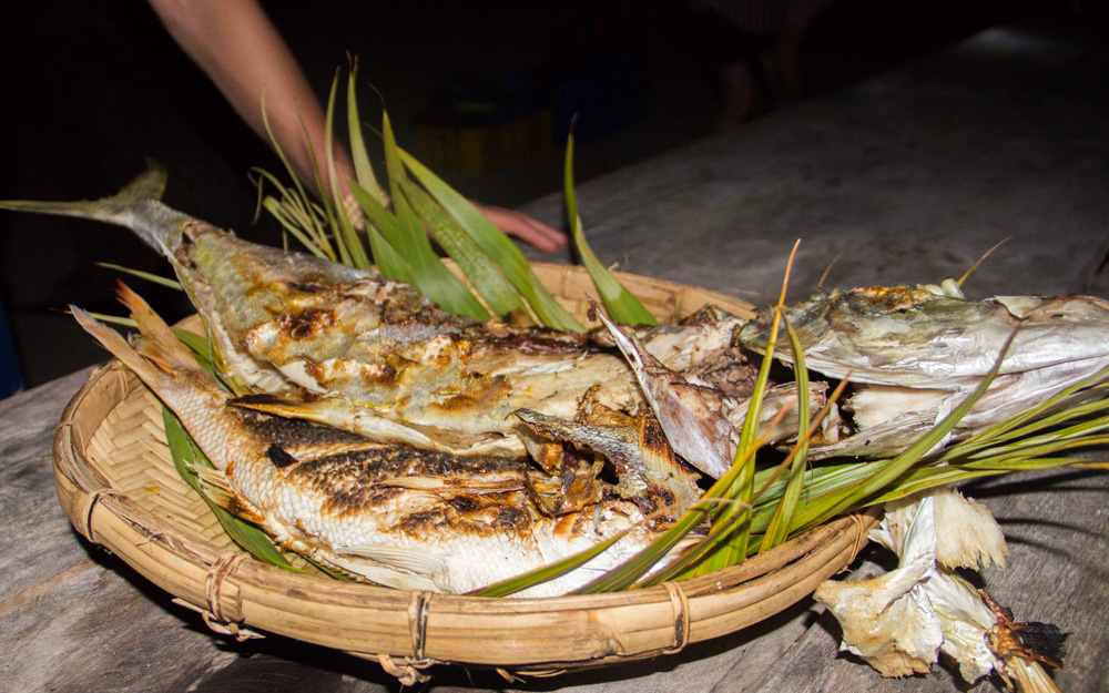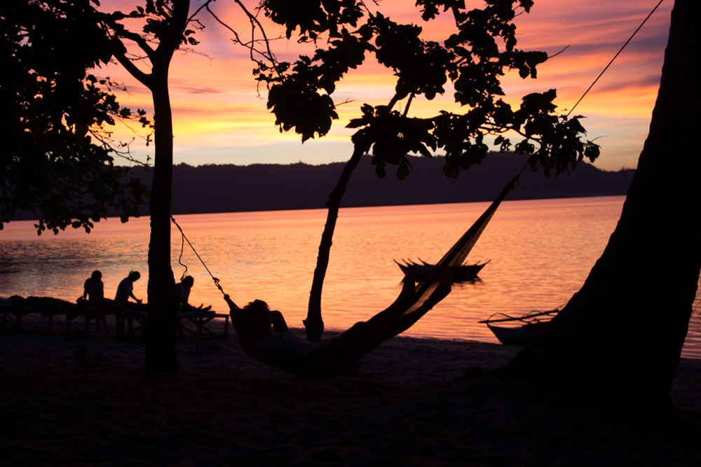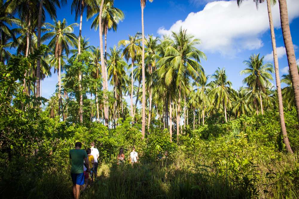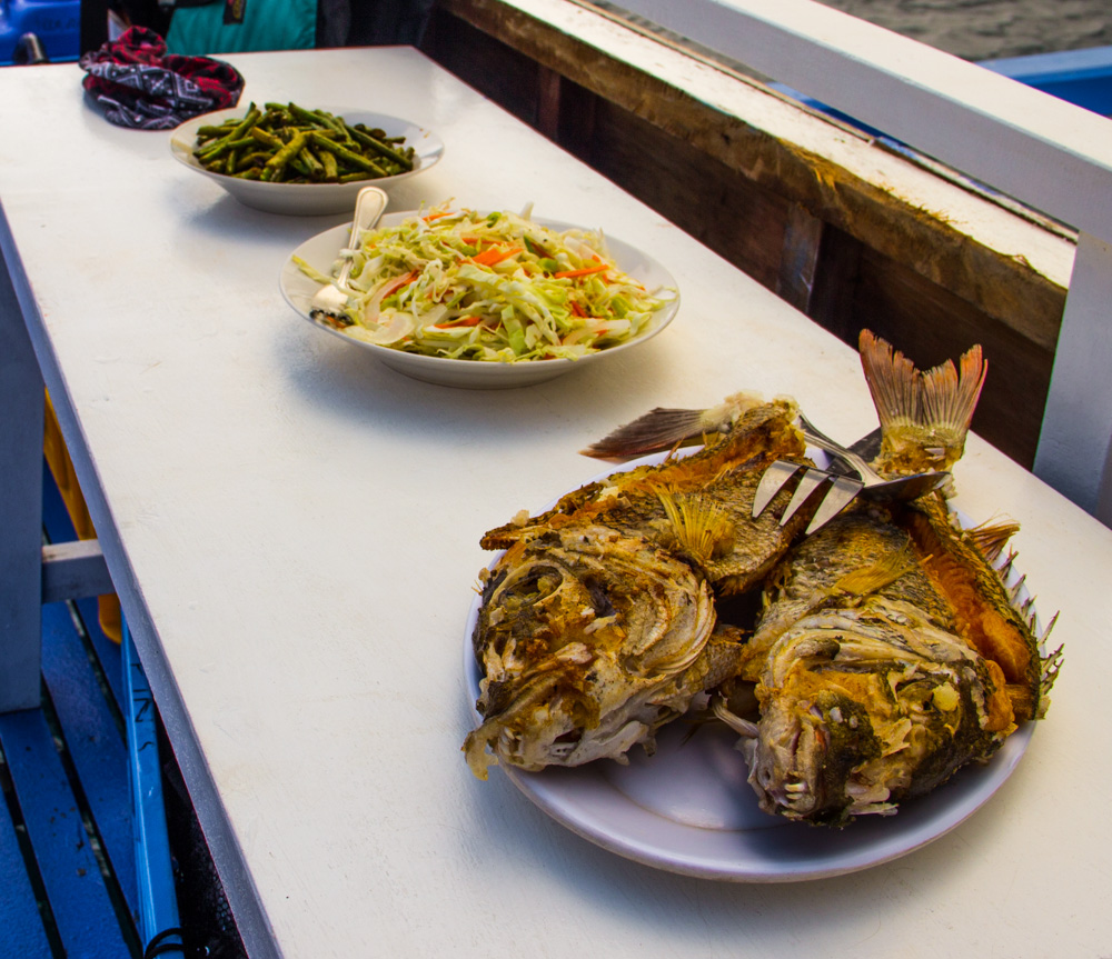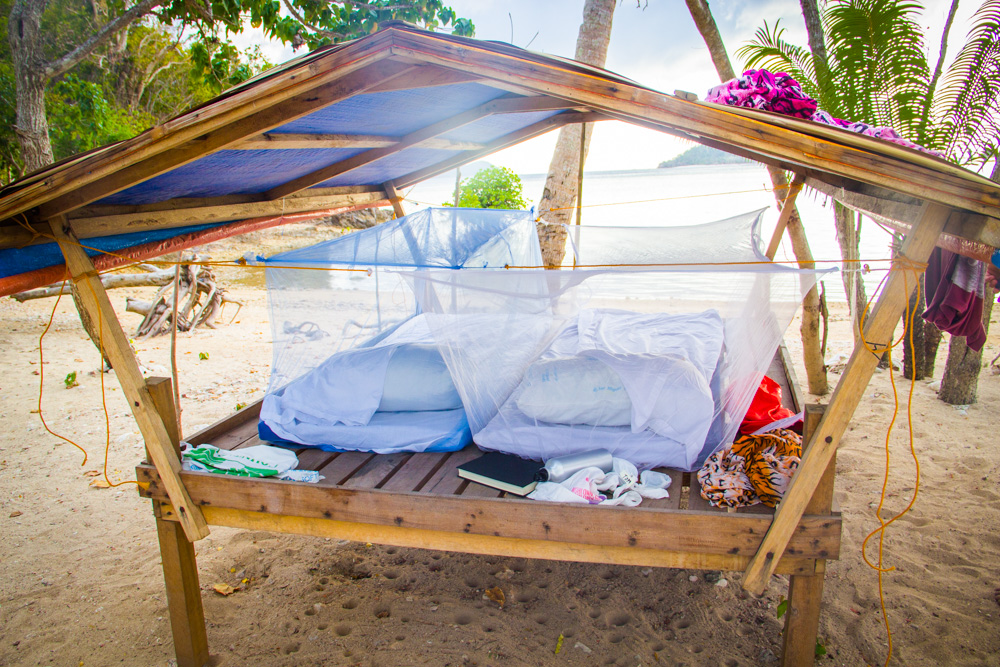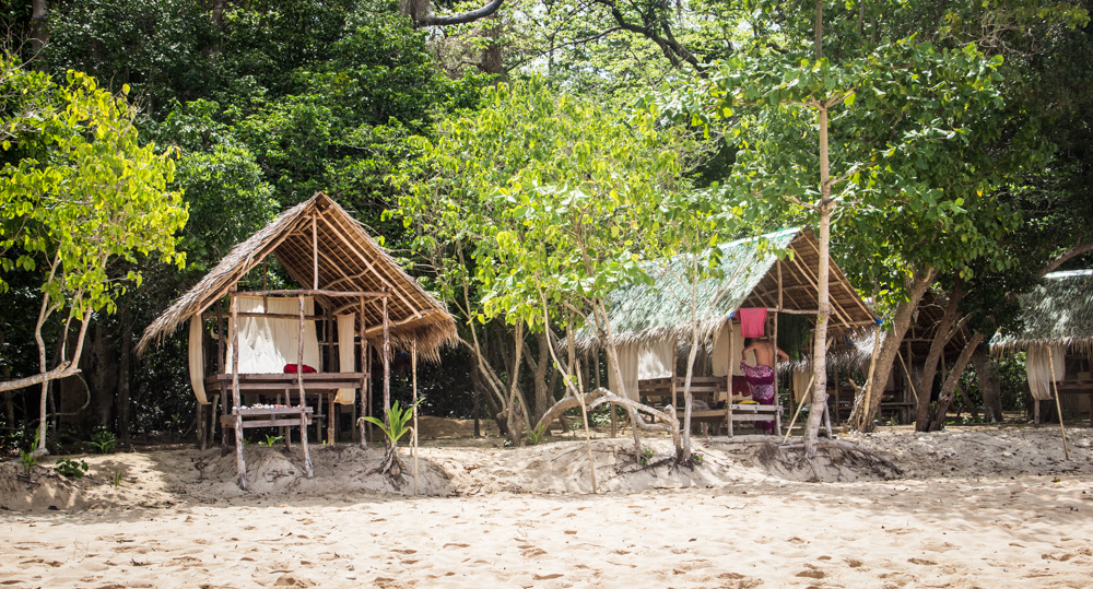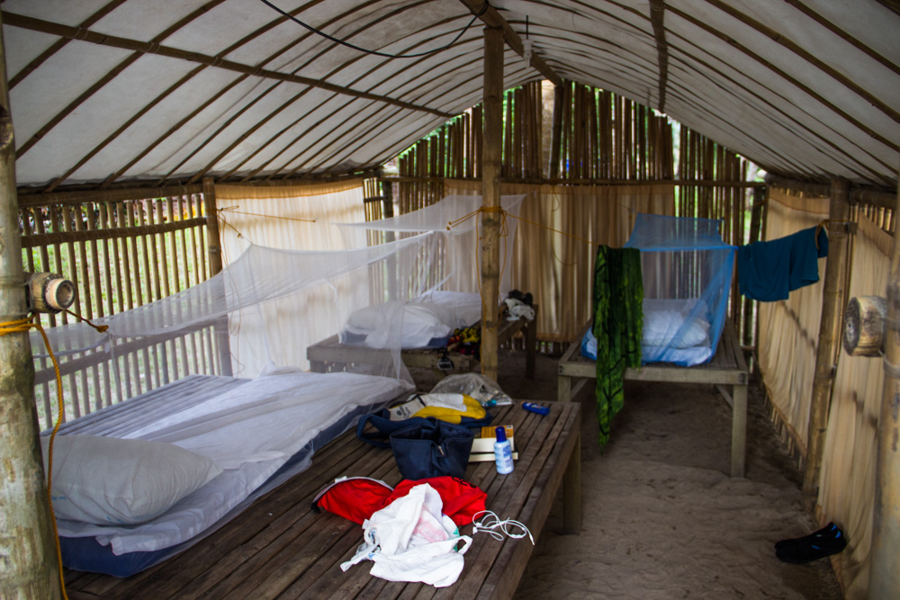 De volgende dag maken we ook weer verschillende stops. Het leven op zo’n boot en de eilanden bevalt prima! Af en toe afkoelen in het water, lekker lezen, muziek luisteren, kaarten of gewoon lekker slapen. Onderweg worden er in een klein dorpje krabben gekocht en ook deze worden weer bereid door onze chef. Na een hoop gekloot om zo’n beest open te krijgen besluit ik dat krab toch niet echt mijn ding is (Veel te veel moeite voor een klein beetje eten). De dag vliegt dan ook weer en in de avond komen we aan op ons derde basecamp. Een heel mooi basecamp zonder andere eiland bewoners. Onze hutjes staan letterlijk aan de rand van de jungle en je hoort dan ook de meest vreemde junglegeluiden. Savonds wordt er een kampvuur gemaakt en onze reisleider pakt de gitaar erbij. We we hebben tot diep in de nacht rond het vuur gezeten, rum gedronken en slap geouwehoerd. De volgende morgen staan er heerlijke bananenpannenkoeken op ons te wachten en is het alweer tijd om dit kamp te verlaten.