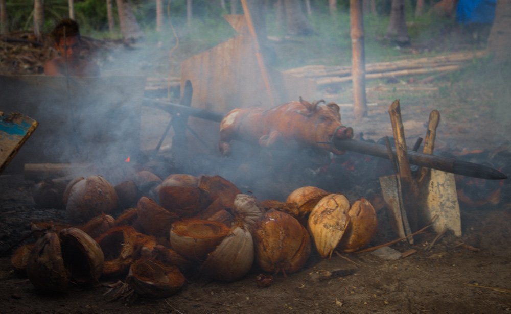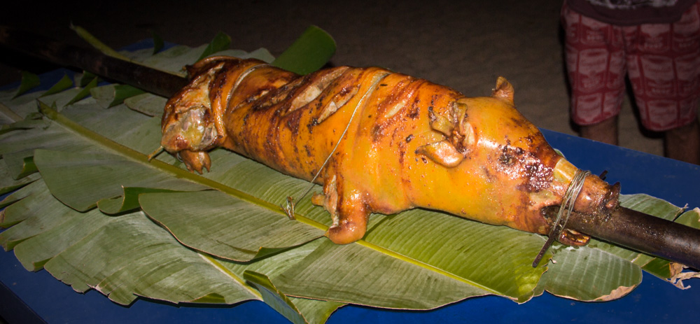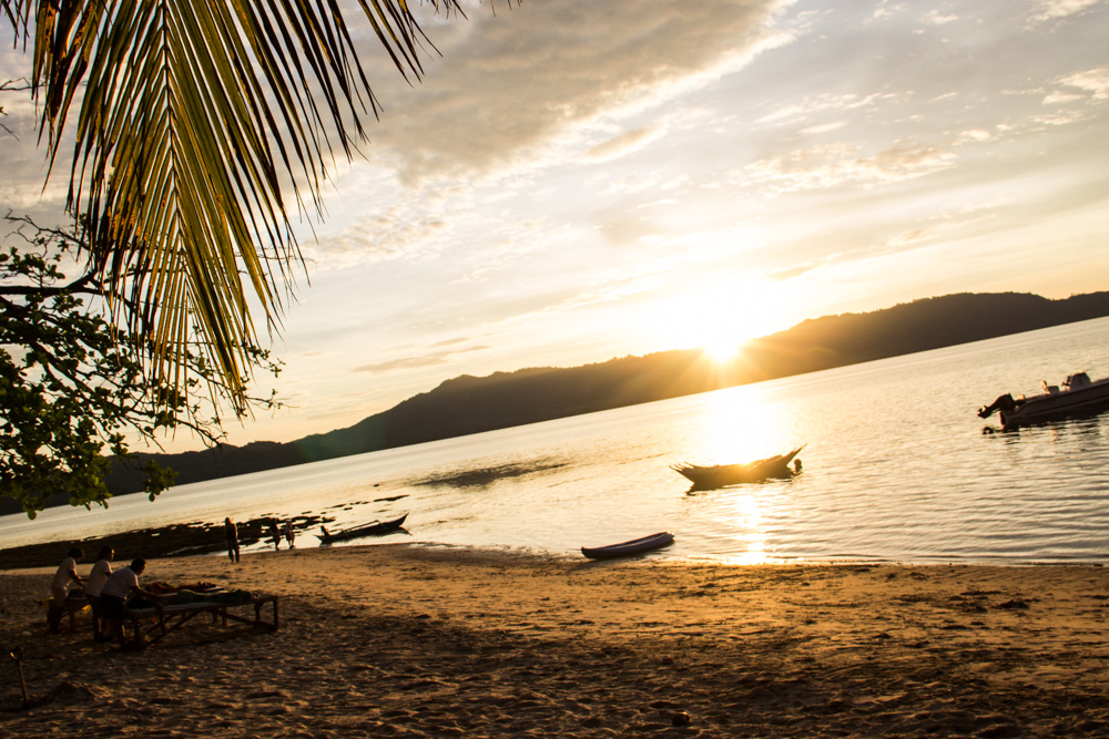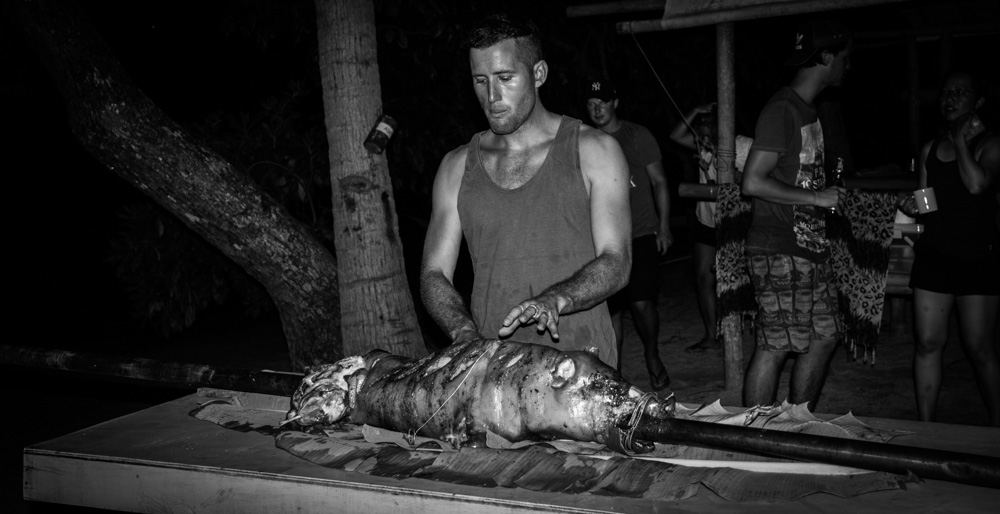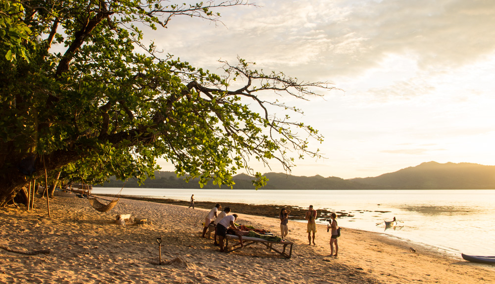 De vierde dag is alweer aangebroken en voordat we het weten zijn we alweer op ons laatste basecamp aangebroken! Dit is het grootste basecamp en wordt de boerderij genoemd. Zodra we aankomen zien we een vuurtje met daarop een varken aan het spit. Dat wordt ons avondeten voor vanavond maar we moeten nog een paar uur wachten totdat hij klaar is. Voor de laatste keer maken we onze bedden klaar en daarna kunnen we genieten van een schitterende zonsondergang! Het varken wordt van het spit gehaald en wordt verdeeld. Ik heb nog nooit zo lekker varken gegeten! Je weet niet wat je proeft! Na het eten wordt het tijd voor ons ultieme relax moment: Onze massage op het strand! Het is inmiddels volle maan en nadat we nog wat nazitten en wat kaarten wordt het tijd om voor de laatste keer te gaan slapen op zo’n mooi eiland.