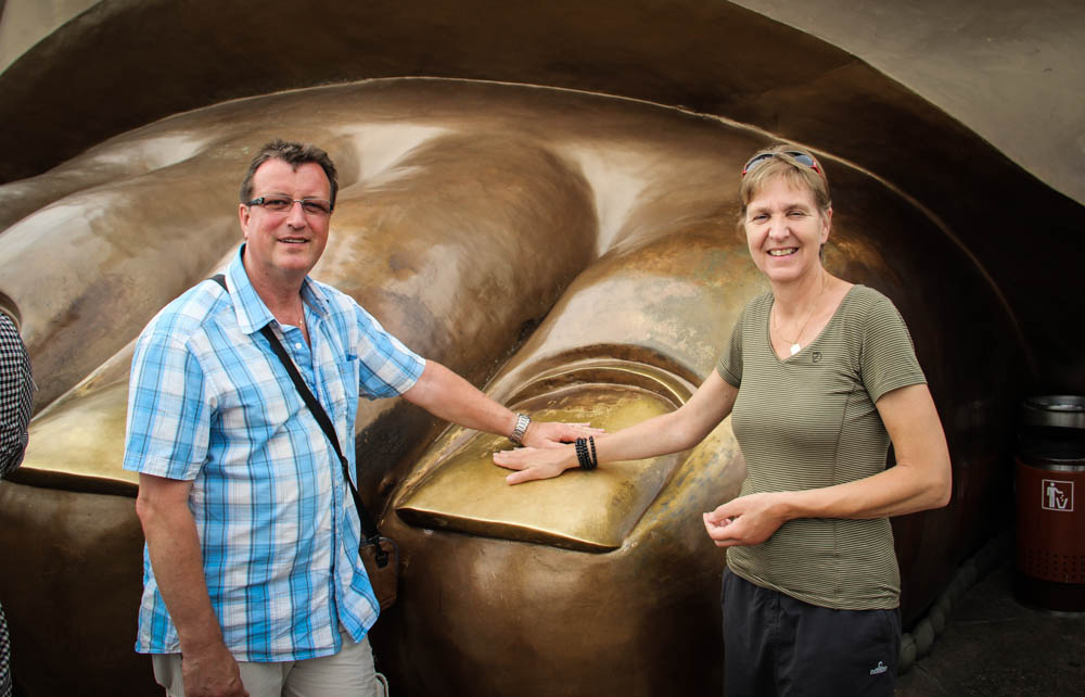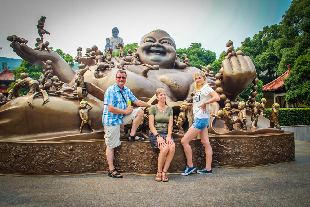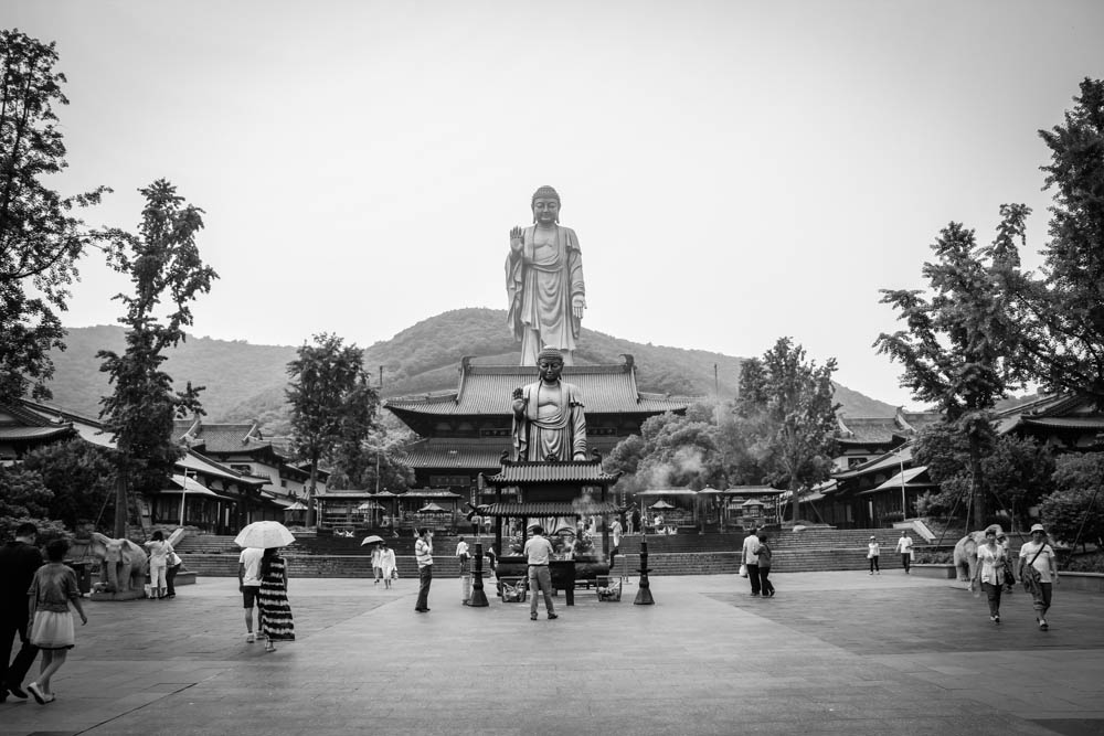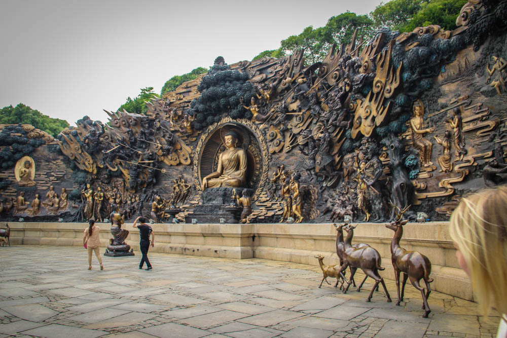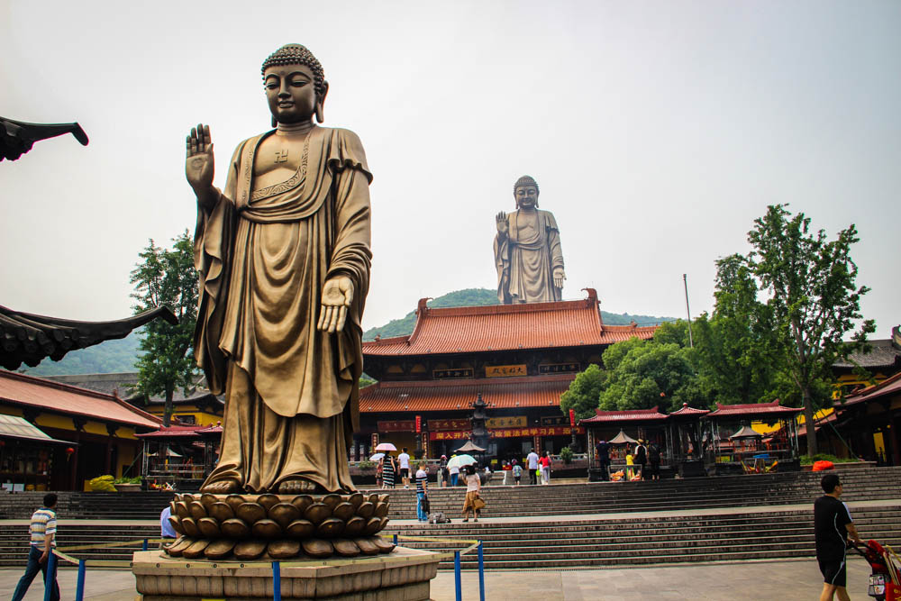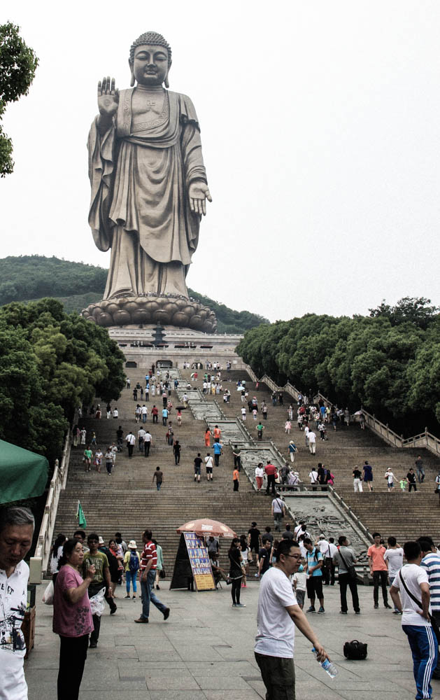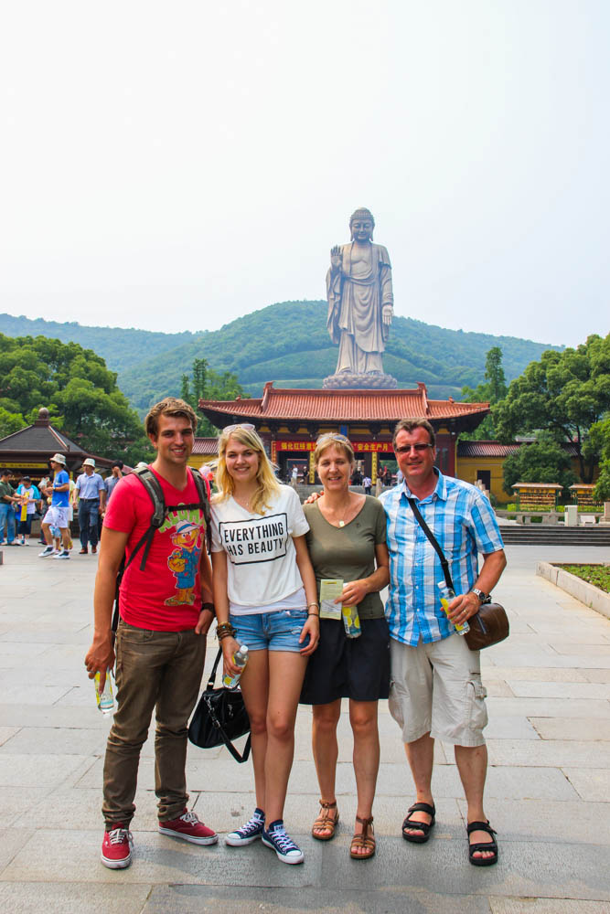 Bijna alle dingen waar ik mijn ouders mee naar toegenomen had ik al gezien, behalve het Buddha Park in Lingshan. Op een zaterdag zijn we vroeg begonnen aan de reis van 4 uur om daar te komen. Als je hier in China met de trein wilt reizen heb je altijd je paspoort nodig om tickets te kopen. Was ik even vergeten, maar gelukkig kwam ik er al achter toen we praktisch aan de ticket balie stonden… Weer terug naar het hotel en appartement dus (voor niks zo vroeg op gestaan), en na deze valse start lukte het nu wel om de tickets te kopen en met de trein naar Wuxi te gaan. Vanaf Wuxi was het de bedoeling om de bus te pakken die ons in twee uur naar Lingshan zou brengen. Eenmaal aangekomen bij de bushalte stond er een vrouwtje die alvast de tickets voor het park verkocht voor een goedkopere prijs daar én inclusief vervoer ernaartoe wat ook nog eens sneller zou zijn. Klinkt goed toch! Nou het was inderdaad goedkoper en sneller, maar ik snap ook waarom. We werden met een klein busje gebracht die nog gemaakt is voordat de mensen hier de vering in auto’s hadden uitgevonden was de rit nou niet echt comfortabel. De vering (of het gebrek eraan) was zelf zo beroerd dat het kleinste hobbeltje er al voor zorgde dat je met je hoofd tegen het plafond klapte. Gelukkig was de rit sneller en na een uur werden we verlost en mochten we uitstappen voor de ingang van het park.
