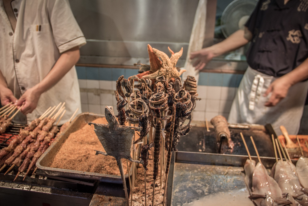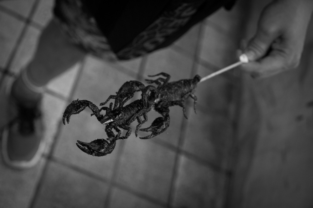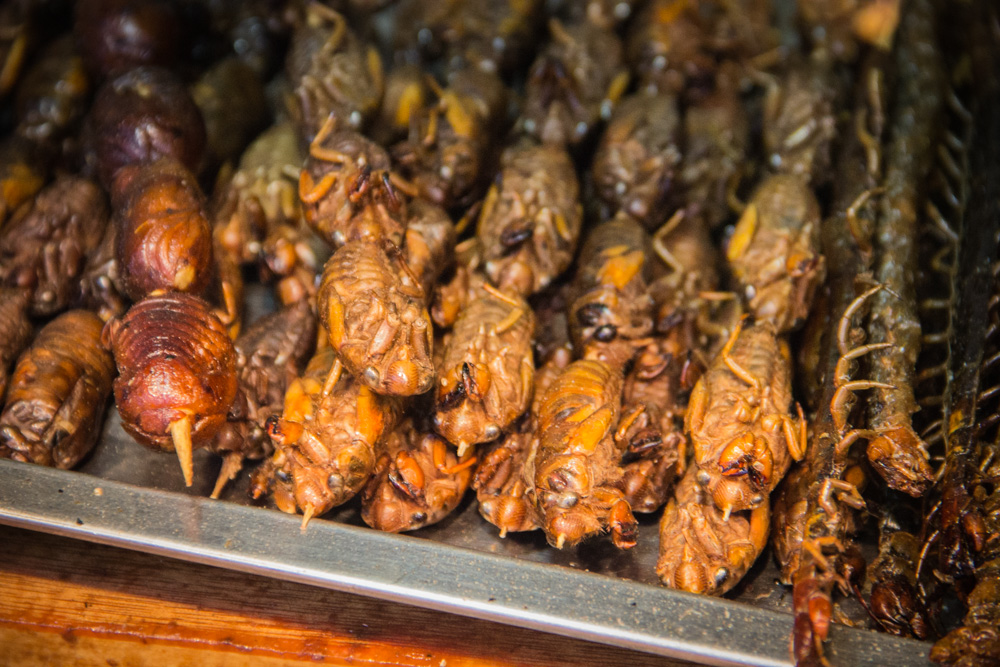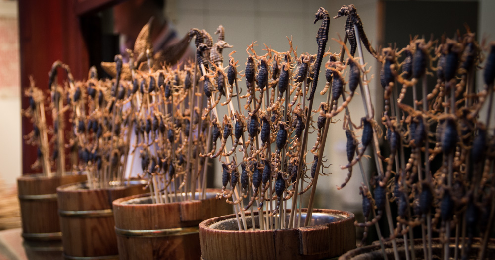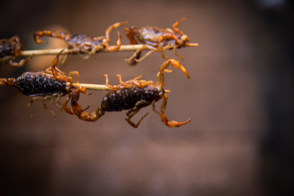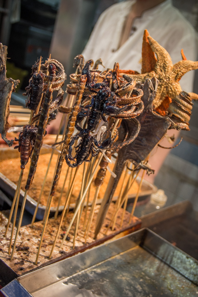 Een van de bekendste straatjes in Beijing heet Wang fu jing, oftewel Foodstreet. Het staat bekend om zijn Chinese delicatessen. Dit houdt in insecten, schorpioenen, zeepaardjes, je kan het zo gek niet bedenken of ze hebben het daar. Een van de eerste ‘delicatessen’ die ik gegeten heb waren minischorpioenen. Nog spartelend op een stokje worden ze een paar seconden in de frituur gehouden, wat kruiden erover en je kan ze eten. Gek genoeg smaakte het helemaal niet verkeerd! Aangemoedigd door deze meevaller besloten we om ook een grote schorpioen te proberen, maar dit was dan weer niet te eten! Knijterhard en er zat een soort bittere zwarte smurrie in. Na een hapje zit je daar wel vol van.